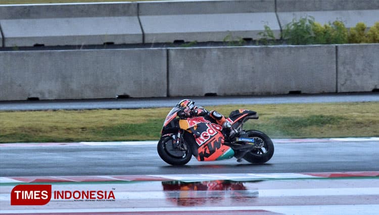 TIMES Tuban/Pembalap tim Red Bull KTM, Miguel Oliveira melahap trek basah Sirkuit Mandalika, saat lomba seri kedua MotoGP di Mandalika, Lombok, NTB, Minggu (20/3/2022). (FOTO: Tria Adha/TIMES Indonesia)