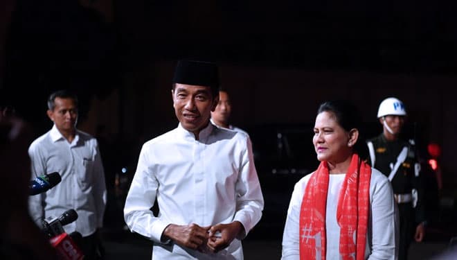TIMES Tuban/Capres nomor urut 01 Joko Widodo bersama istri Iriana Joko Widodo tiba di lokasi untuk mengikuti debat Pilpres 2019 putaran kelima, di Hotel Sultan, Jakarta, Sabtu (13/4/2019). (FOTO: Rivan Awal Lingga/Antarafoto)